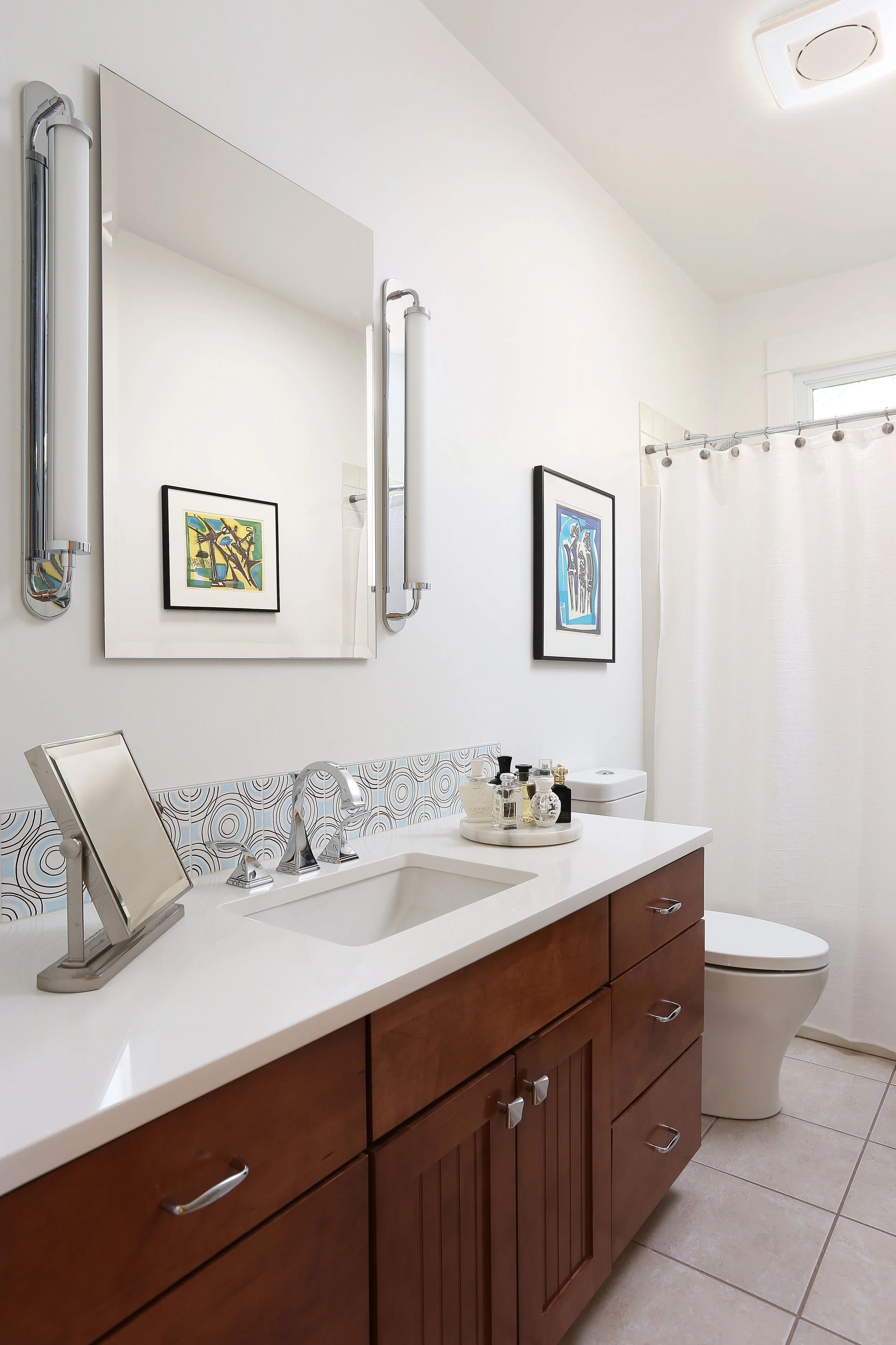 Empty nesters needed desperately to revitalize their dated (yet sturdy) rural home, located in the heart of dense, private woods. The inspiration was their eclectic art collection and affinity for geometry and bold color choices. The substantial renovation includes a new modern fireplace, flooring, furnishings and plenty of interesting details. Photos by David Sparks. Contracting by Berghuis Construction.